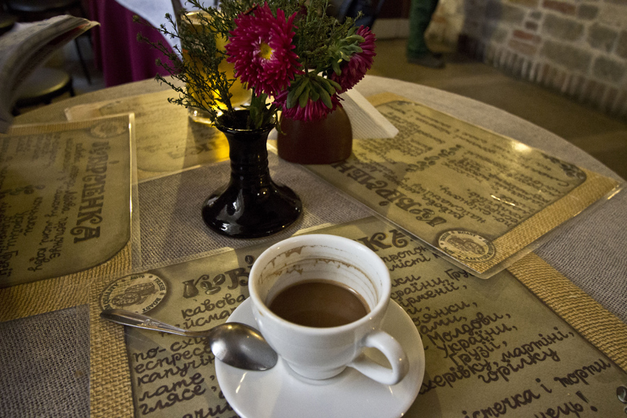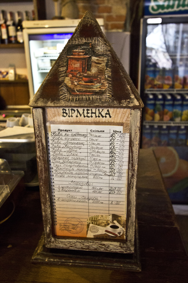 The effect is thick, essential coffee with unique intensive but also a mild taste. It was similar to coffee in Vietnam but without chocolate tang. What’s more coffee in Viermanka is very cheap. It costs 15 – 25 UAH (aroun 1 $ or €). You don’t belive it? Just take a look at the menu: