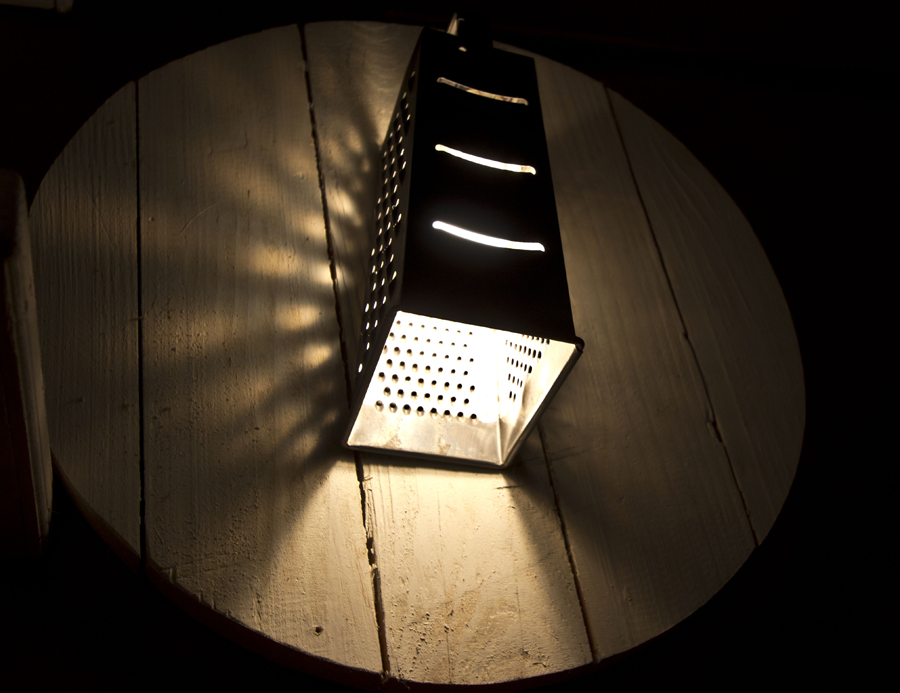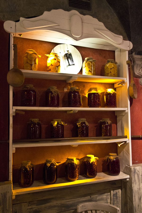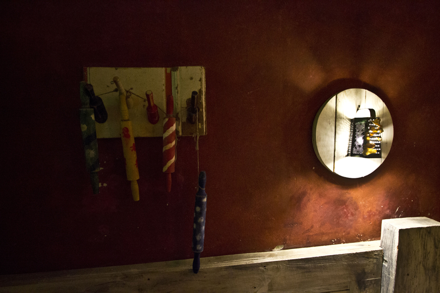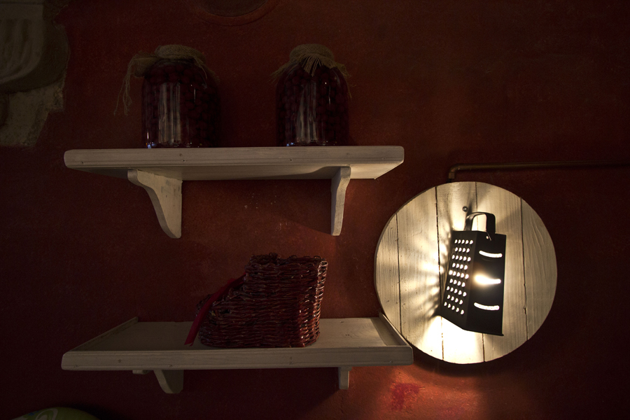 Accesories such as rolling pins, grinders and, shelves with preserves and lamps made of graters, decorate claret walls.