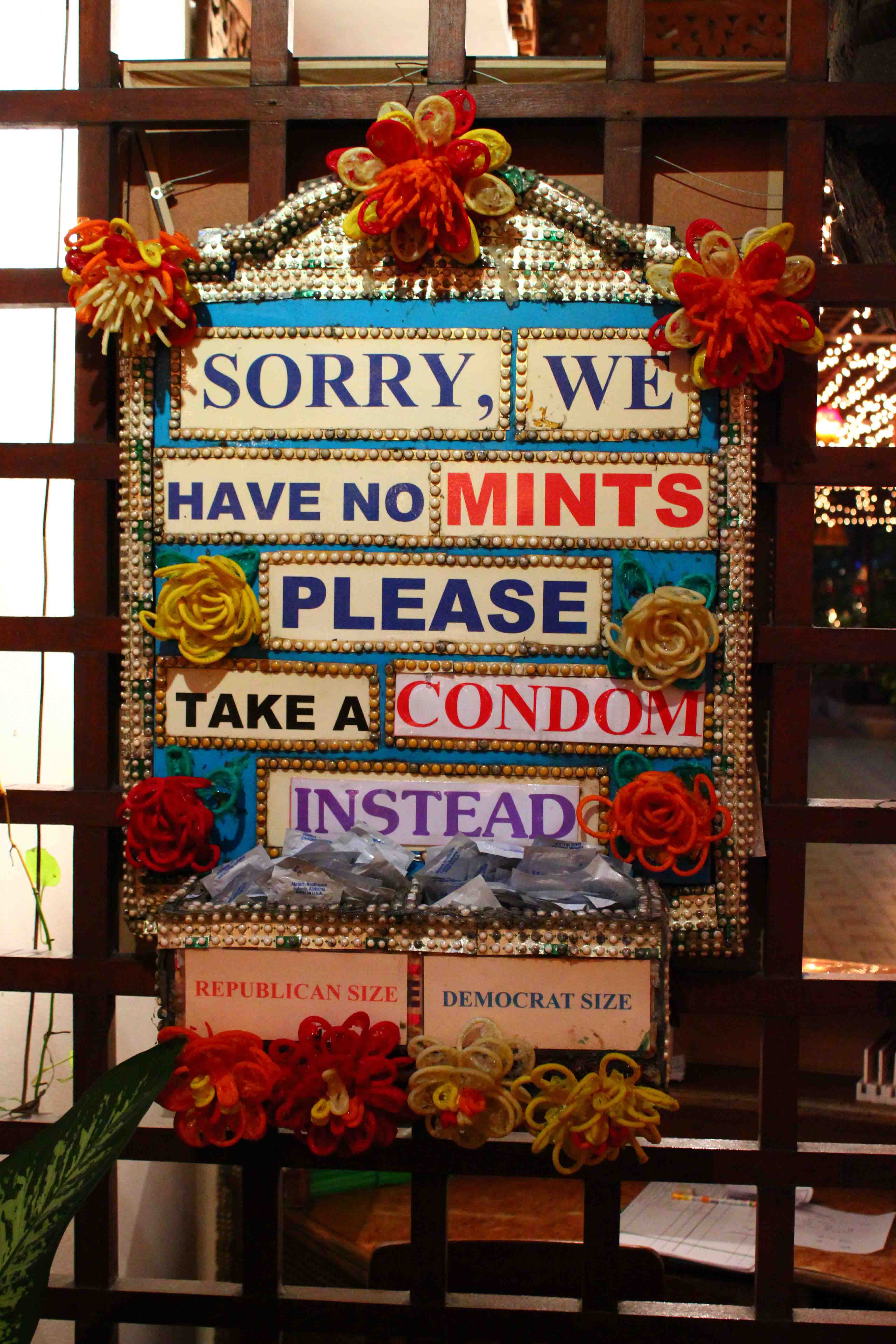 This restaurant, apart from serving traditional Thai dishes, promotes using condoms and votes part of its income for AIDS prevention.