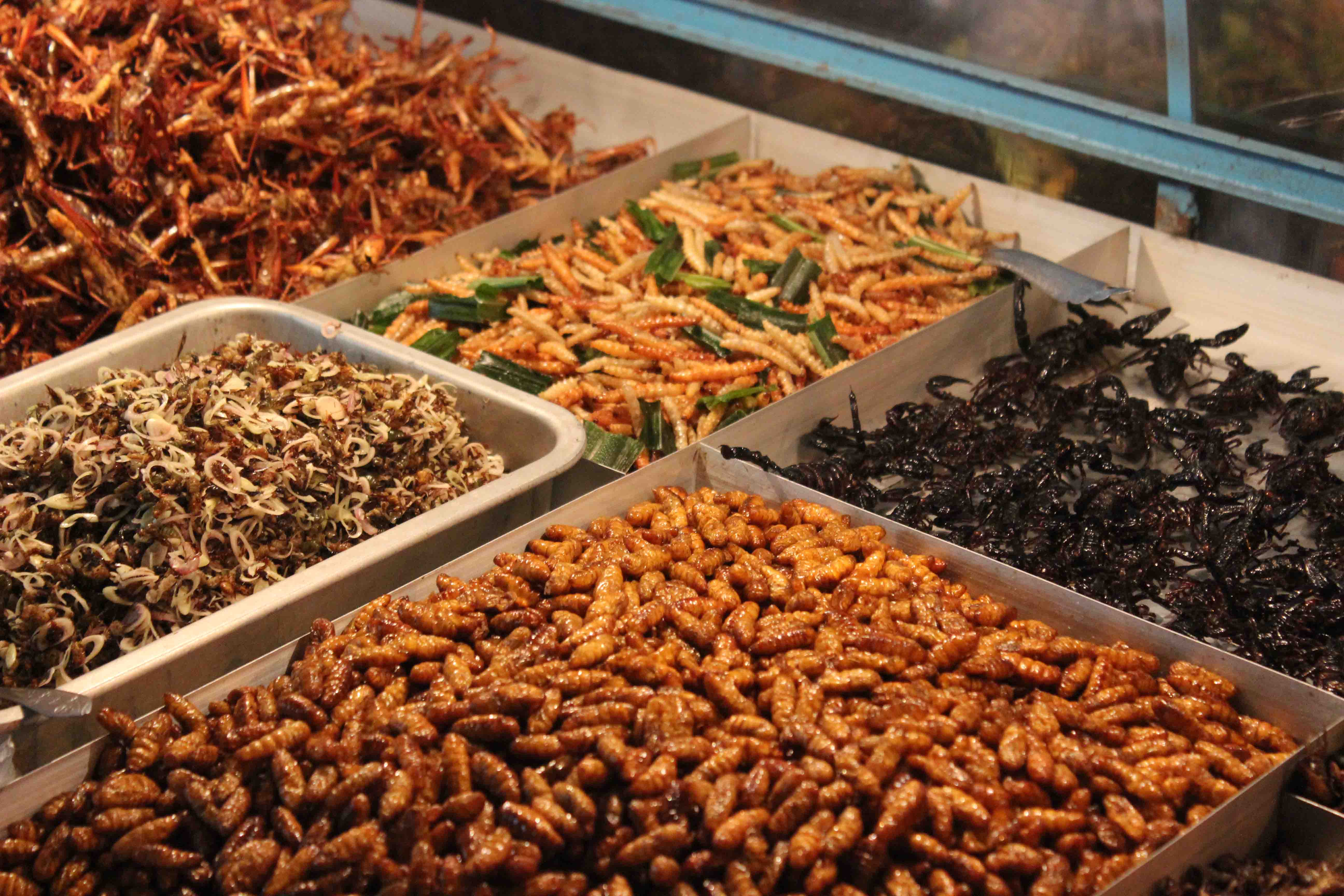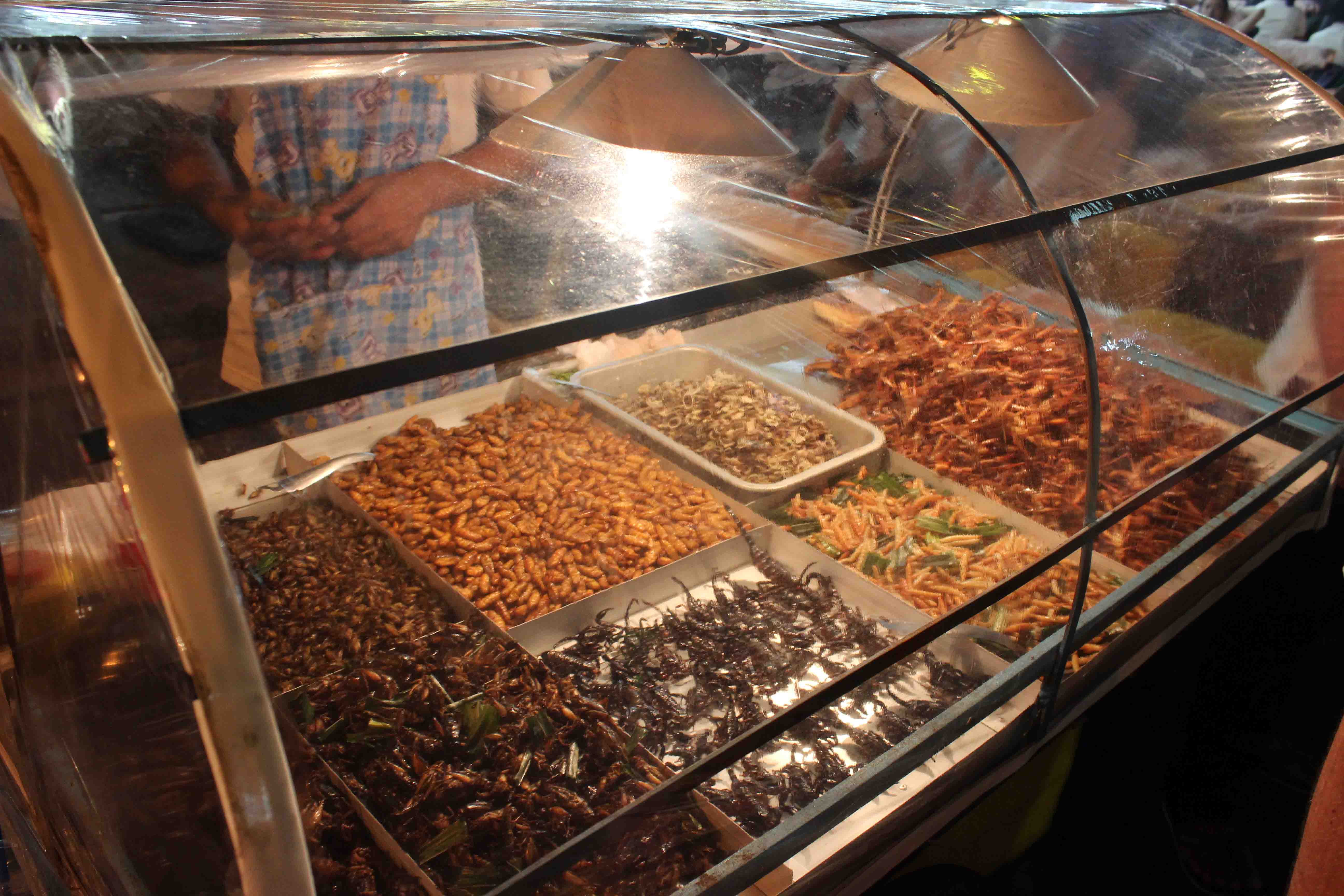 Some of insects are also popular refreshment in Thailand. They aren’t as popular on Bangkok streets as in the northern Thailand. Stalls with these delicacies are mainly on touristic Khao San Road. Choice is really big, you can eat there deep fried grasshoppers, silkworms or termites. The special snack are bamboo larvae called “express train” in view of their oblong shape. In a word – yummy.